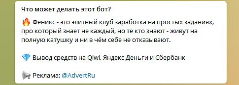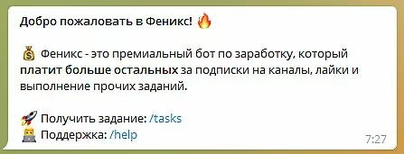 В телеграмме бот Феникс позиционирует себя как инструмент для автоматизации и заработка. Владельцы этого якобы «премиального» источника дохода, предлагают участникам подписаться на каналы, просмотреть записи, поставить лайки и выполнить другие простые действия.