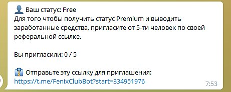 Название переводится как Феникс Клуб Заработка. Однако, вряд ли получится жить у вас “на полную катушку”, вступив в него, как обещают создатели бота.