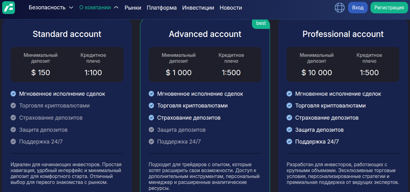 - Advanced account. Вход от 1000 долларов. Леверейдж Fen Qzr site — 1 к 500. Доступна торговля криптовалютами, есть страхование депозитов.