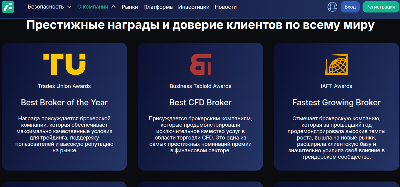 Следующий блок, который команда презентует как уникальный — перечень престижных наград, показывающих доверие пользователей со всего мира. Ничего необычного в этом разделе нет — всю информацию разработчики скопировали с сайтов других брокеров.