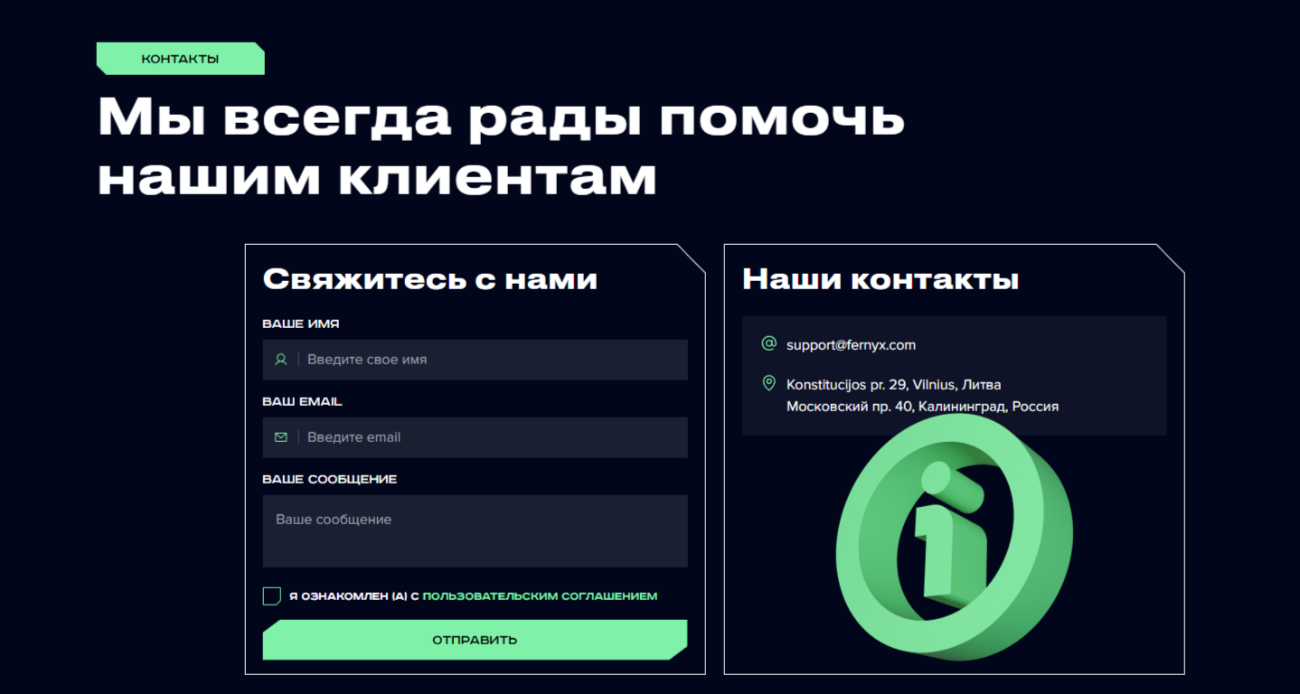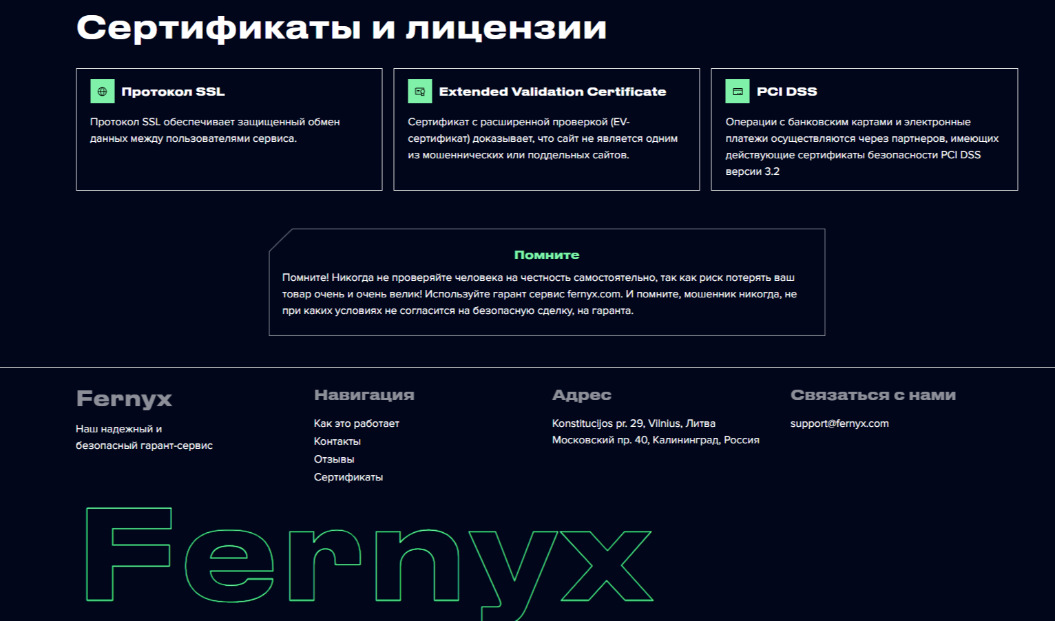Ни один из разделов веб-сайта fernyx com не содержит данных о юридических документах и лицензиях компании. В разделе «Сертификаты» представлена лишь информация о Extended Validation Certificate, PCI DSS и протоколе безопасности.