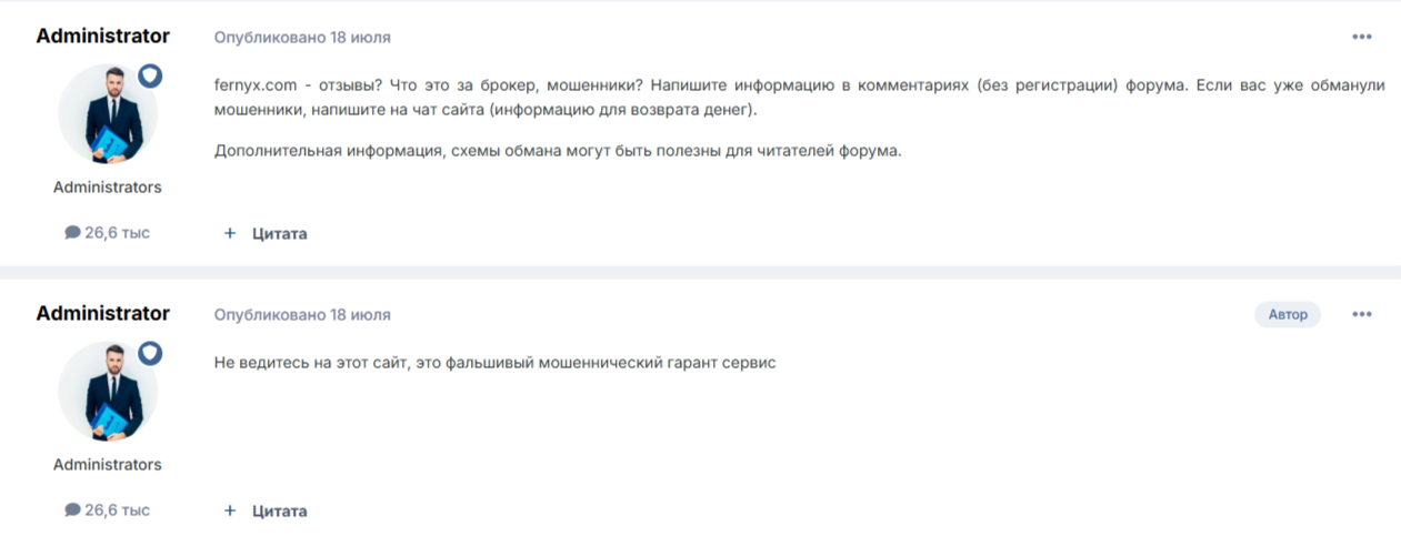 В процессе проверки мировой паутины мы обнаружили положительные комментарии на официальном сайте сервиса и нескольких профильных ресурсах. Правдивость упомянутых о портале fernyx com отзывов вызывает большие сомнения. Так как среди них много комментариев, якобы написанных в 2024 году. Стоит напомнить, что в этот период платформы для безопасных транзакций еще не существовало.