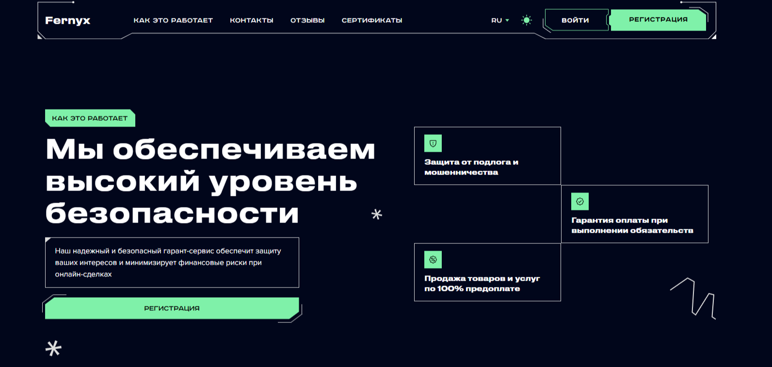 Брокерский сайт fernyx com – новая платформа для безопасного трейдинга. На портале предоставляет свои услуги не классический брокер, а гарант сервис, который следит за выполнением условий сделок между покупателями и продавцами. Упомянутая организация не предлагает целевой аудитории торговать на международных рынках валютными парами и другими активами с узкими спредами. К услугам участников торговли удобная платформа, простое урегулирование споров, автоматизированные транзакции. Стоит ли задумываться о партнерстве с проектом – узнаете из нашего нового обзора.
