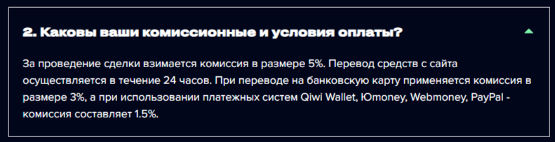 Сервис «Ферникс Ком» предоставляет целевой аудитории только платные услуги. Информацию о них можно найти в разделе вопросов и ответов. Здесь представлены данные о том, что за проведение сделок администрация веб-сайта взимает 5% от суммы платежа. Вывод средств с личного счета на портале на сторонние платежные сервисы занимает до 24 часов.