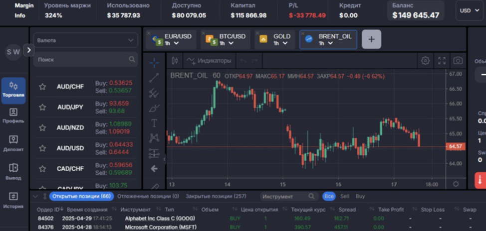 - возможность торговать одновременно на нескольких рынках с одного счета: фондовый, валютный, сырьевой и криптовалютный;