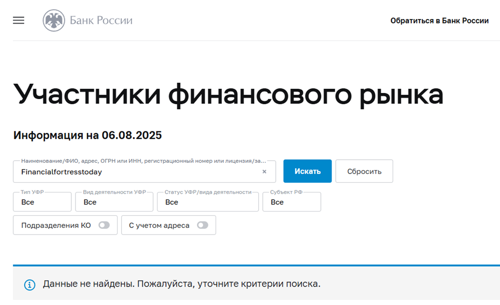 Financial Fortress Today — очередная псевдоинвестиционная платформа, маскирующаяся под легальный проект. Отсутствие лицензии, регистрация в офшоре и нереалистичные обещания доходности — явные признаки мошенничества. Не дайте себя обмануть!