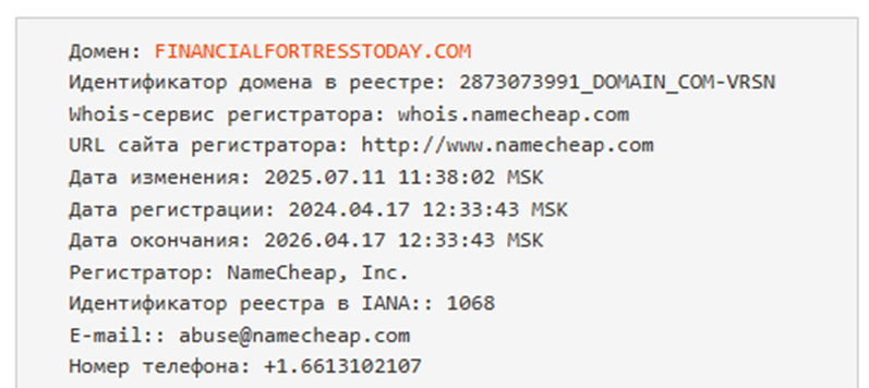 К сожалению, в веб-архиве нет данных о существующих редакциях сайта Financialfortresstoday Com до момента последнего обновления. Есть только сообщение о том, что «домен недавно зарегистрирован» от 11 июля 2025 года. Эта дата немногим ранее первых отзывов «довольных клиентов», так что велик риск, что фактическое время работы финансового посредника меньше месяца, а все эти обзоры заказаны на бирже фриланса.