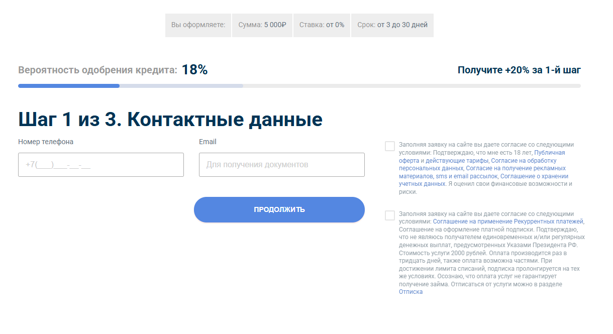 Вся деятельность платформы сводится лишь к тому, что человек заполняет анкету, в которой указывает свои данные, а уже представители сервиса присылают анкету по МФО и банкам. При этом услуги оказываются не просто не бесплатно, а в формате подписки. Таким образом, условия займа, вероятность одобрения вообще никак не связана с работой платформы. Зато списание 2 тысяч рублей будет гарантированным. При этом списание не будет разовым.