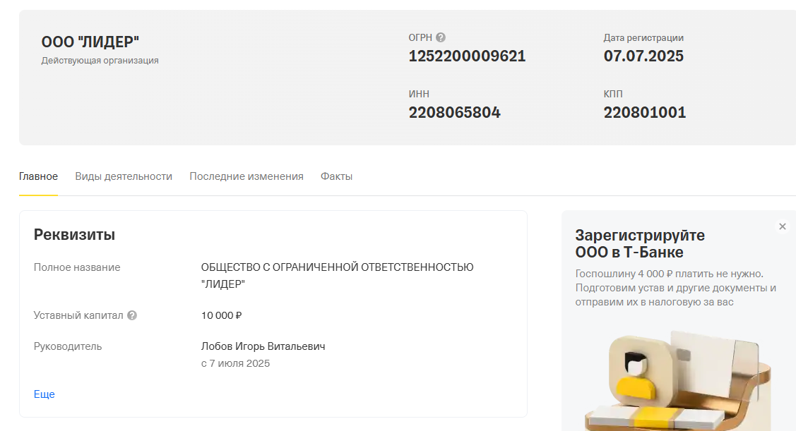 ООО Лидер – юридическое лицо, которое стоит за проектом, зарегистрировали в июле 2025 года: