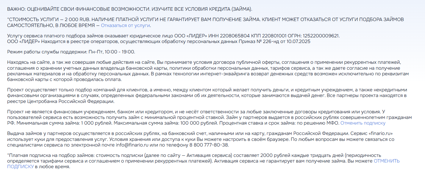 Вот только никаких бесплатных займов здесь нет. Да и займы предоставляются не самой организацией. Она выступает в качестве агрегатора займов. При этом сервис работает платно. У человека, который пытается воспользоваться срочным займом, сначала списывают 2 тысячи рублей за услуги подбора. Уже подобные рекламные обещания показывают, что компания Финарио больше похожа на развод.