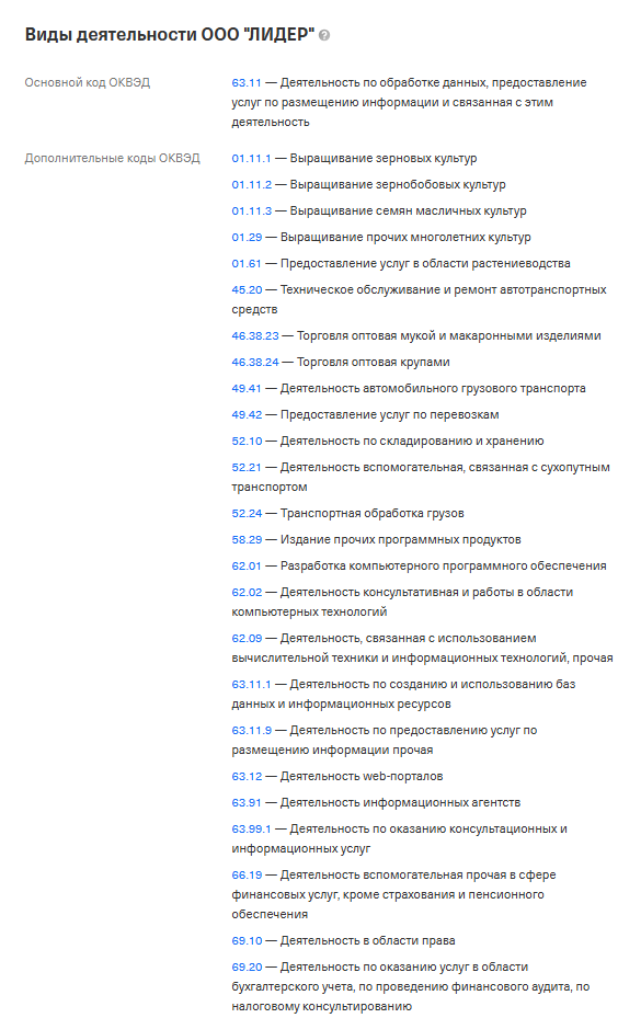 - у компании, стоящей за сайтом более 40 ОКВЭДов;