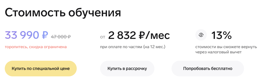 Стоимость обучения в Finfed напрямую зависит от длительности курса. Например, для получения доступа к программе, которая рассчитана на 2 месяца, необходимо заплатить около тридцати пяти тысяч рублей.