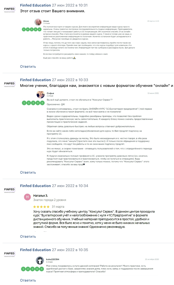 На официальных медийных ресурсах образовательного центра и школы «Финфед» присутствует множество сообщений, которые содержат отзывы от клиентов. Все они положительные.