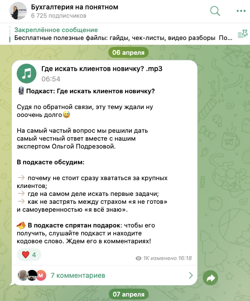 В ленте ТГК присутствует в том числе профессиональный контент, например, в виде подкастов. Посты собирают в среднем по тысяче показов и 3-10 лайков. Под некоторыми публикациями возникают «обсуждения».