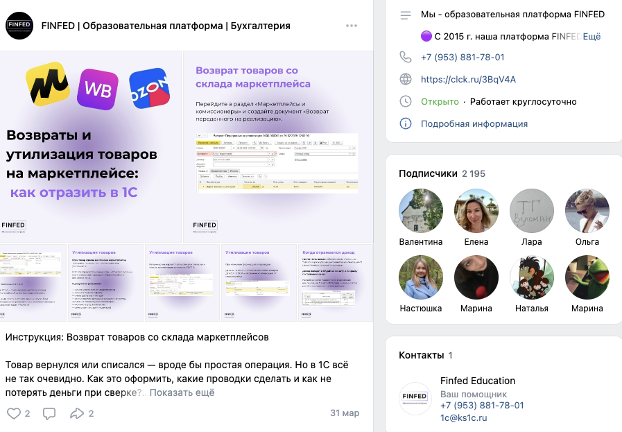 Публичная страница школы присутствует и во «ВКонтакте». Она называется «Finfed Образовательная платформа Бухгалтерия», а насчитывает 2,2 тысячи подписчиков.