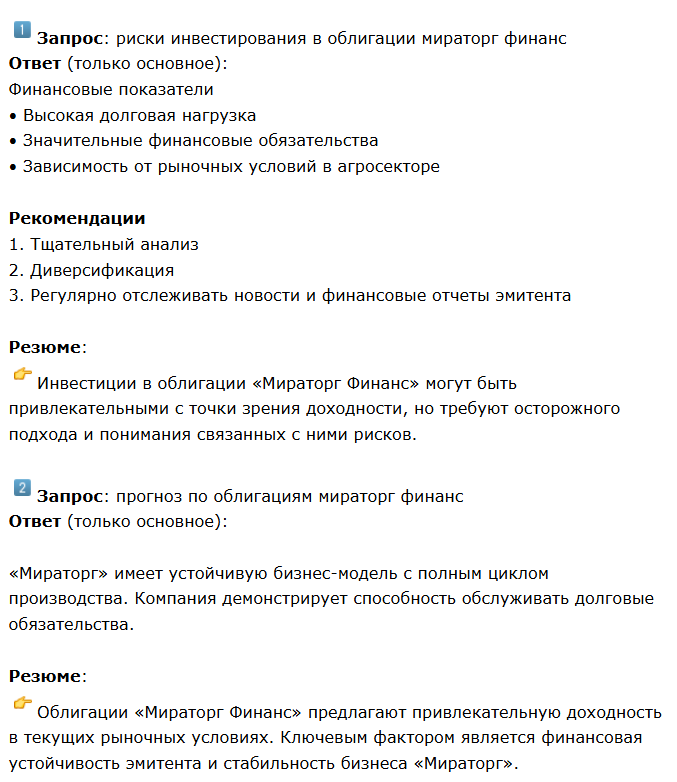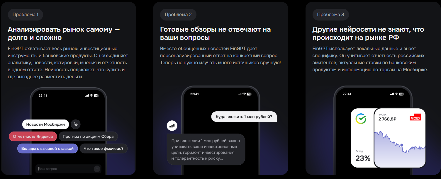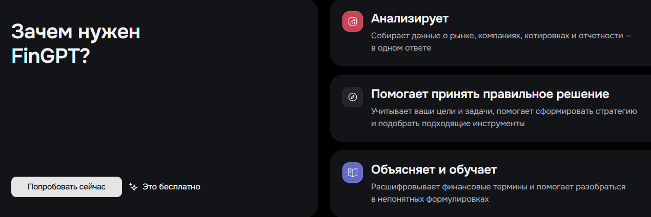 Создатели пишут, что самостоятельный анализ рынка – это долгий и сложный процесс, который якобы сильно упрощается благодаря их модели. Также ресурс может ответить на конкретный вопрос, при этом в ответе он будет использовать актуальные данные о рынке РФ. Решает ли он задачи, связанные с иностранными активами, – непонятно.