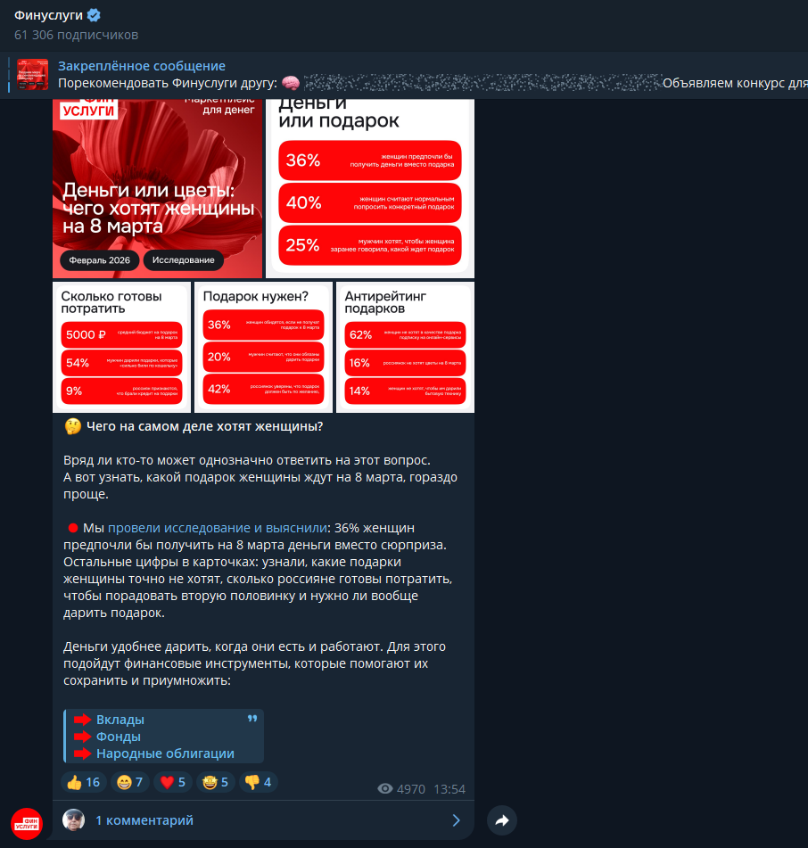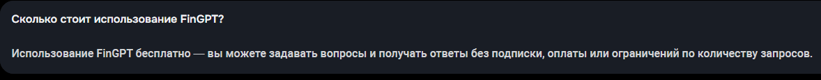 Собственного тг канала у FinGPT тоже не оказалось. Ссылки с площадки ведут на основное сообщество Финуслуг, что еще раз подтверждает наше предположение. Видимо, представители компании решили, что запуск собственного “инновационного ИИ” – это отличный пиар-ход, с чем трудно не согласиться.
