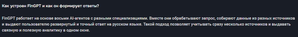 В FAQ мы также можем узнать, что ФинДжипити отталкивается от вердиктов целых восьми AI-агентов с разными специализациями, но сами эти специализации не указаны. Кроме того, непонятно, какая модель была взята за основу или же это вообще собственная разработка.