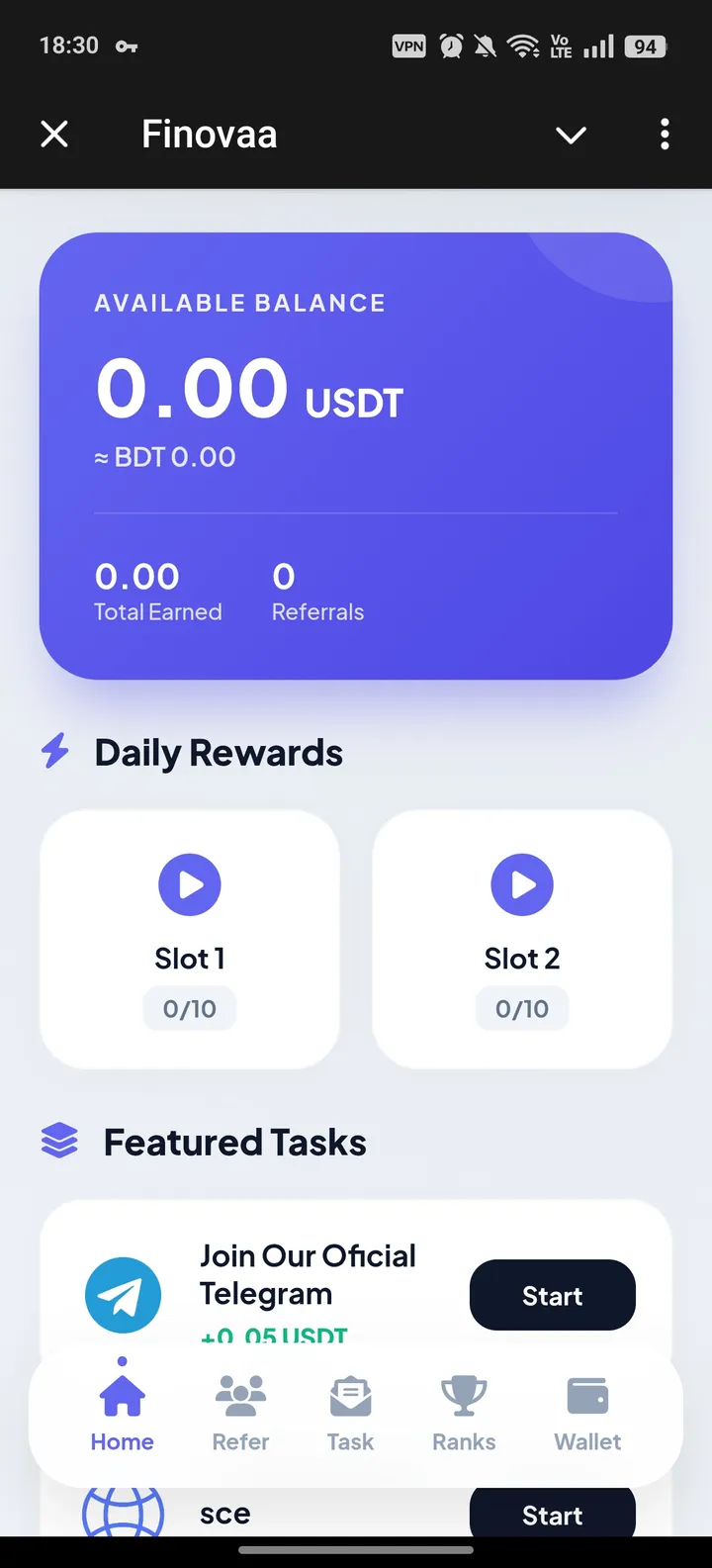 Finovaa предлагает несколько способов заработка. Один из них – ежедневные задания, которые обновляются раз в сутки. Среди них: просмотр рекламных видео, переходы по ссылкам, выполнение простых действий. Одно задание приносит около 0,1 единицы. В день доступно до 10 рекламных просмотров плюс дополнительные акции, где тоже можно заработать.