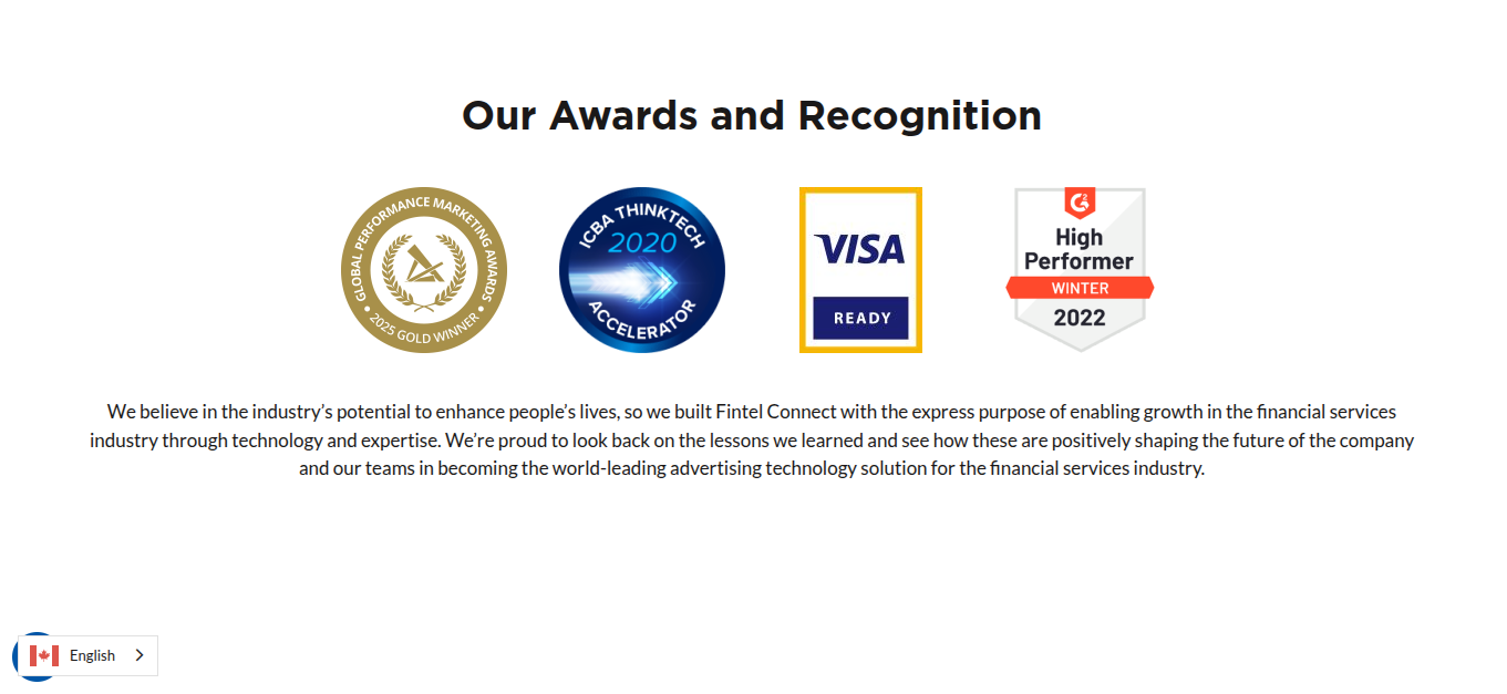 Следующий раздел — список наград, которым так гордится команда. Премии 4: Global Marketing Awards, ICBA ThinkTech, VISA Ready, High Performer. Идентификаторов нет, поэтому проверить наличие наград невозможно. Из этого можно предположить, что Команда Fintel Connect в очередной раз врет, чтобы привлечь внимание клиентов.