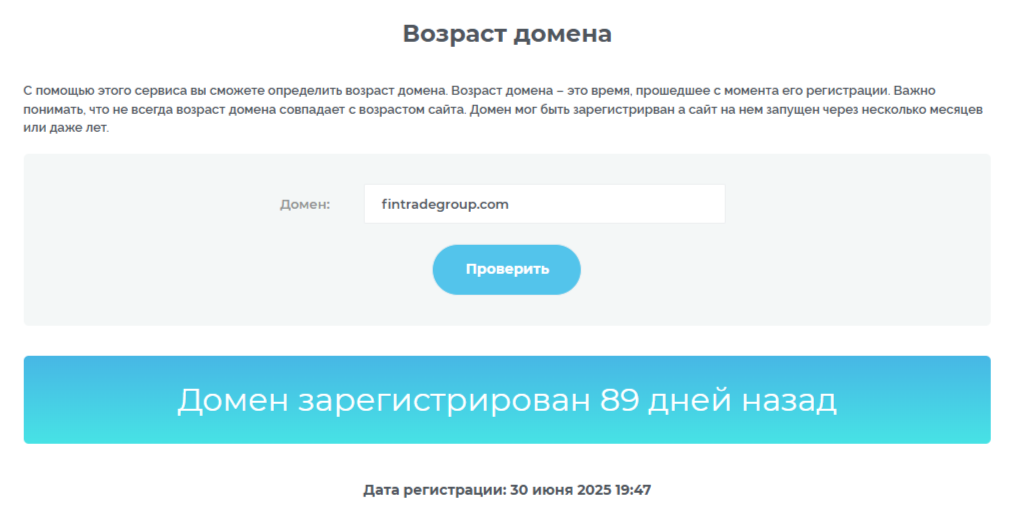 В процессе проверки веб-сайта брокера мы выявили, домен fintradegroup com зарегистрирован 30 июля 2025 года. Сегодня посреднику исполнилось 89 дней. Непрофессионализм оформления сайта, молодой возраст портала, фейковые данные о компании и нежелание легально работать на территории РФ говорят о потенциальном обмане и будущих убытках трейдеров.