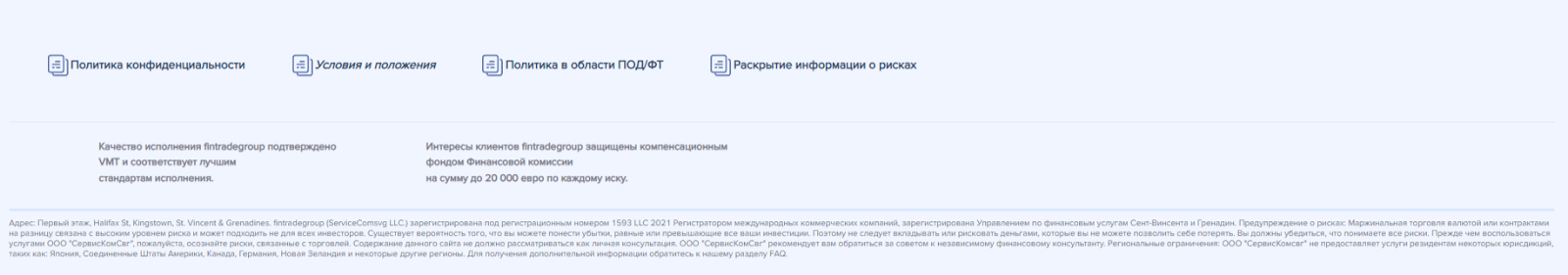 Также футер представляет пользователям информацию об адресе регистрации компании: первый этаж, Halifax St, Kingstown, St. Vincent & Grenadines. Регистрационный номер организации 1593 LLC 2021. Деятельность брокера якобы регулируется Управлением по финансовым услугам Сент-Винсента и Гренадин. Лицензия ЦБ РФ отсутствует.