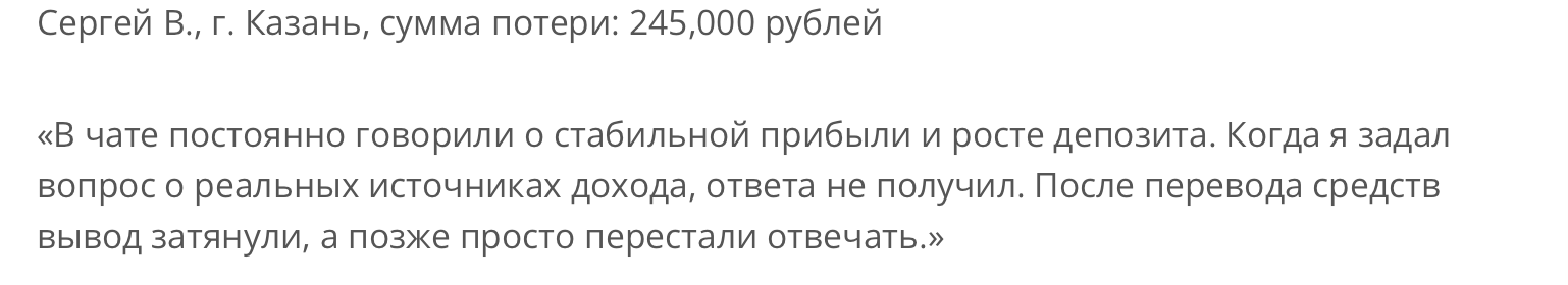 На тематических форумах можно видеть очень грустные истории людей о том, как они потеряли большие деньги из-за скам-бота. Кто-то внес несколько сотен долларов, другие остались без куда более внушительных сумм.