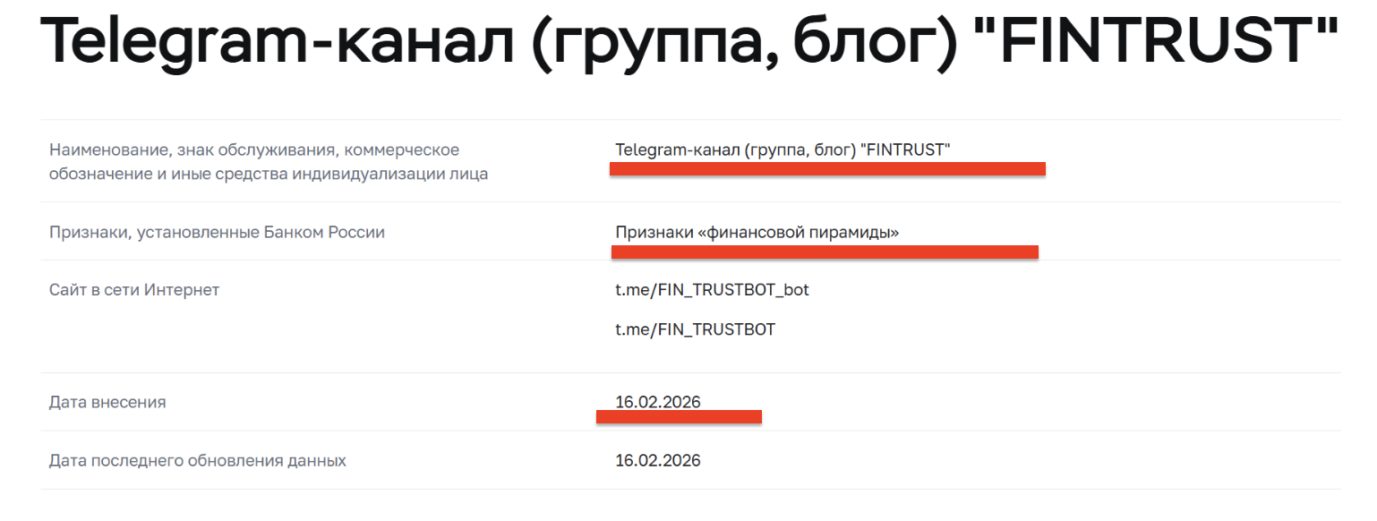 Fintrust — это не инвестиционный инструмент, а классическая финансовая пирамида в упаковке Telegram-робота. Обещания легких денег на арбитраже, многоуровневые рефералки и отсутствие любой прозрачности говорят сами за себя. Проект уже обзавелся плохой репутацией, попав в черный список Центробанка и мониторингов.