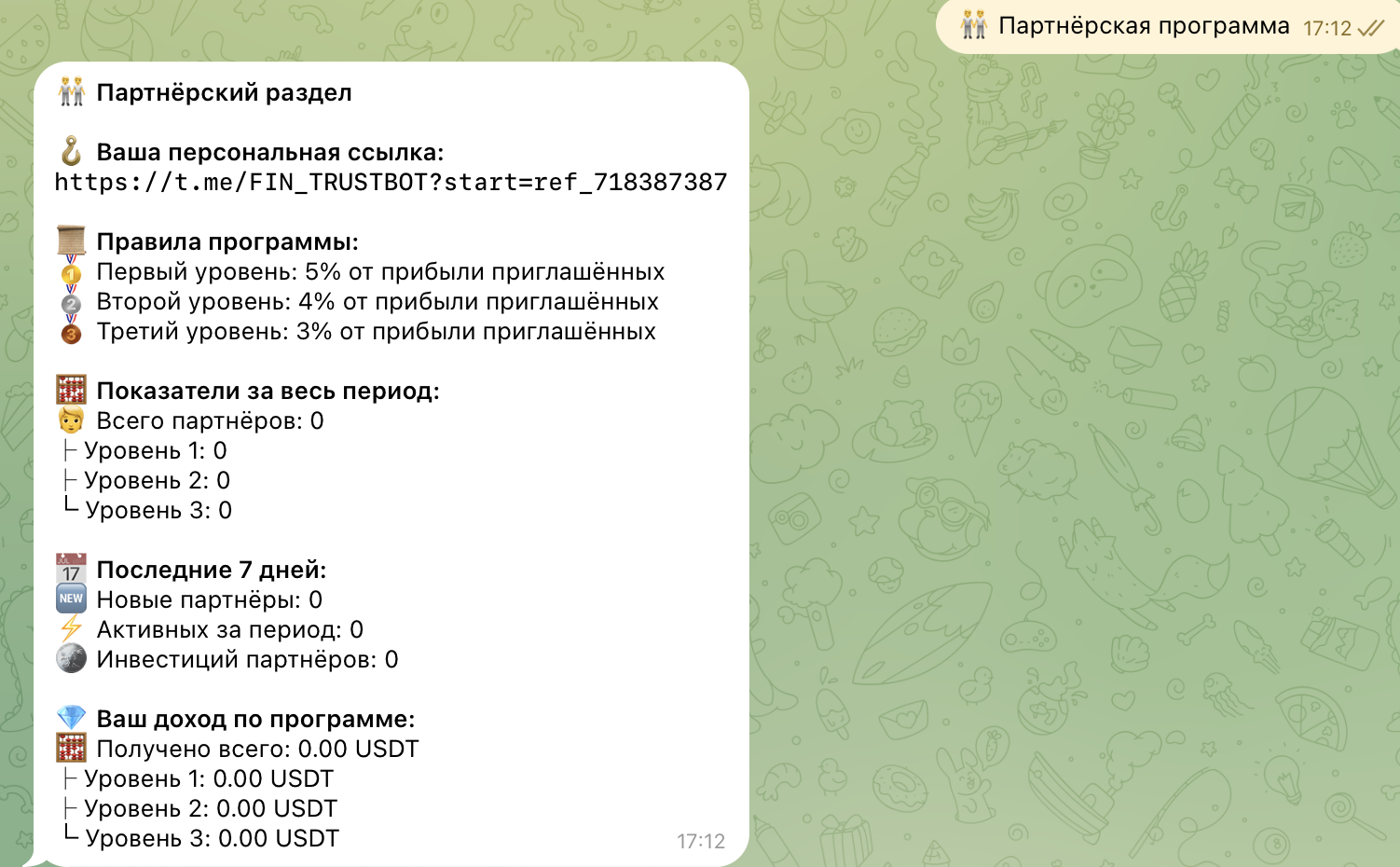 Чем больше активных участников приходит по твоей ссылке, тем выше становится твой личный процент. Плюс предусмотрена классическая многоуровневая реферальная система: владелец бота получает определенный процент от прибыли всех, кого пригласили его приглашенные, и так далее по цепочке.