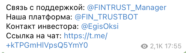 Поиск информации в сети показал, что «Финтраст» — telegram бот, лишенный признаков легального проекта. У него отсутствуют сайт, официальный статус ИП или юрлица. Это автоматически не позволяет сервису вести полноценную инвестиционную деятельность.