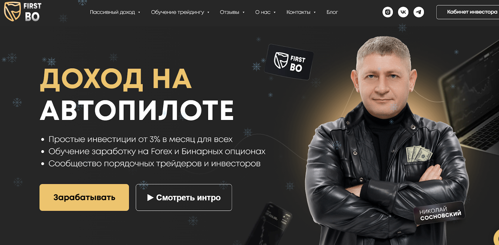 «Ферст БО» – это инвестиционная компания, основатель которой, Николай Сосновский, предлагает полный спектр услуг по заработку на бинарных опционах и других активах. Его организация предоставляет обучение новичкам и реальные инвестиции тем, кто хочет получать прибыль сразу.