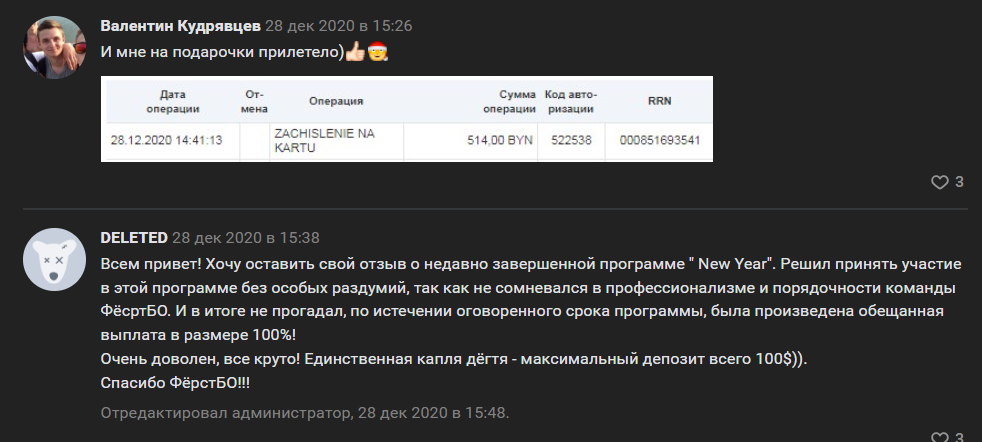 На личных ресурсах компании, в частности, в ВК отзывы о «Ферст БО» только положительные, правда датируются еще 2020 годом и некоторые из них отредактировано администратором.