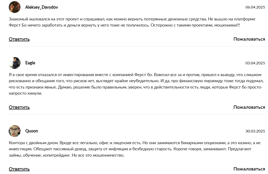 - На форумах в отзывах о «Ферст БО» упоминают о невыплатах и игноре, так что вложения могут быть связаны с риском потери денег.