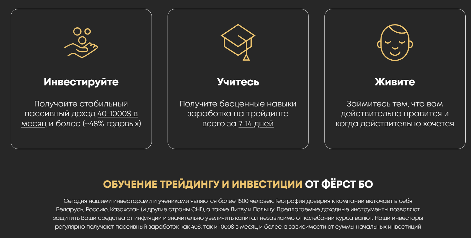На платформе активно продвигается идея дохода на автопилоте с заявленной прибылью от $40 до $1,000 в месяц и более. Также говорится о более чем 1 500 учениках и инвесторах в сообществе First BO.