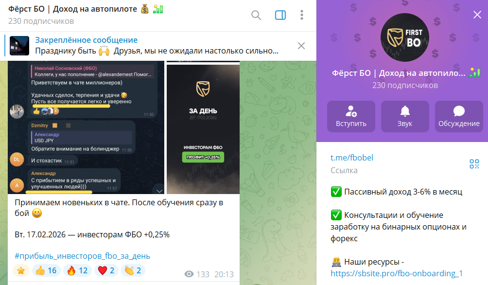 Для активного заработка доступны обучающие программы по бинарным опционам и Forex. По заявлениям, стратегии показывают винрейт от 65% до 80% и потенциальную доходность свыше 100-200% годовых. Также работает закрытый клуб трейдеров с внутренним чатом в Телеграмм и доступом к общению с участниками проекта First BO.