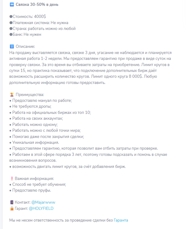 Пользователям предлагались весьма сомнительные сделки. Так, аудитории рассказывали о возможностях заработка без рисков, неких якобы уникальных связках, которые и не планируют угасать. Но заметим, что подобного рода предложения больше похожи на откровенный скам.