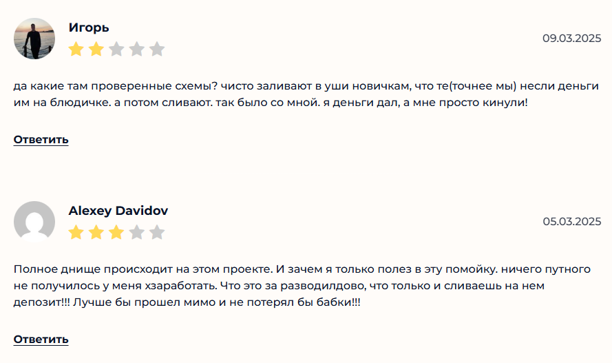 Очередной проект, обещающий золотые горы на P2P-арбитраже, а на деле — пустые слова и фейковые связки. Автор постоянно меняет ники, чтобы скрыться от негативных отзывов, а канал напичкан накрученными подписчиками. Связки ведут на поддельные обменники, где вы теряете все вложенные деньги. Я сам попался на эту удочку и потерял крупную сумму. Не дайте себя обмануть, держитесь подальше от этого мошенника!