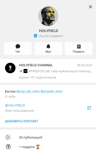 Гарантом о всех сделках был указан некто под ником @HOLYFlELD. Примечательно, что его страница все еще активна, хотя все сообщества сети уже давно были заброшены.