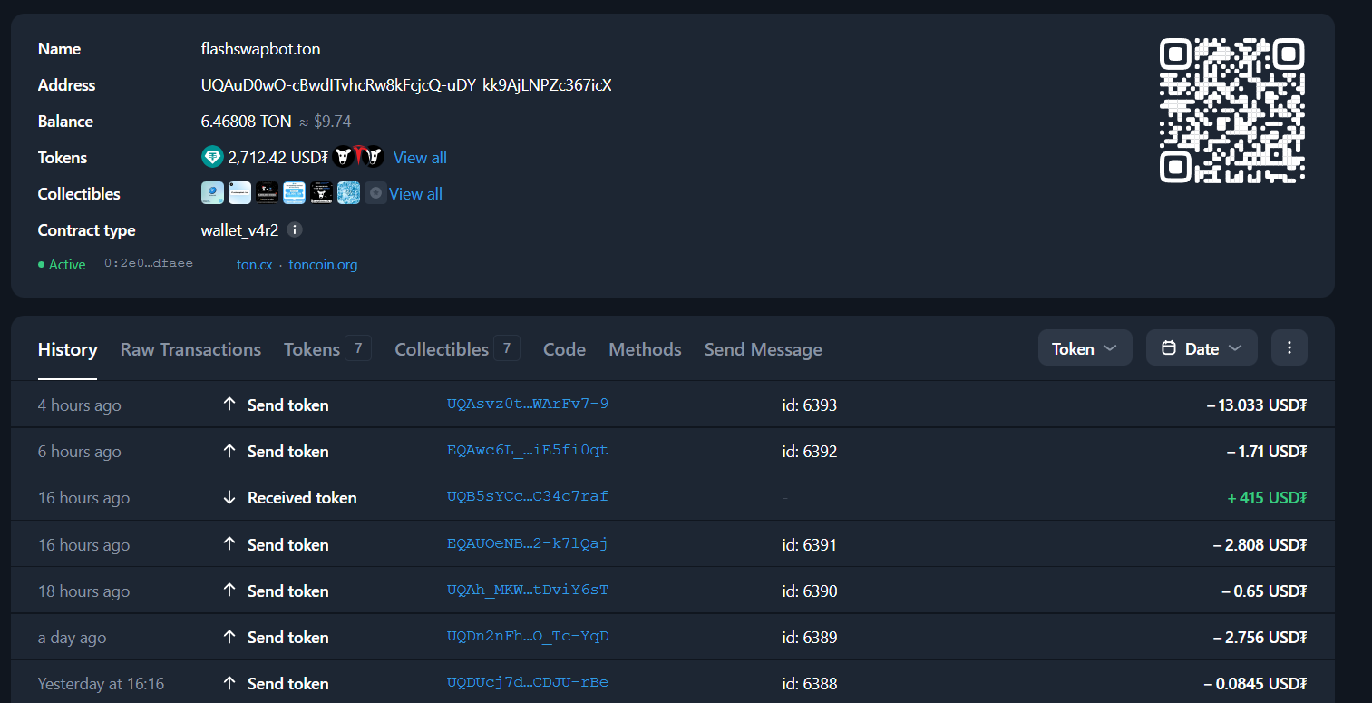 - Активный кошелек FlashSwapbot ton с множеством мелких транзакций служит косвенным признаком работоспособности, но не гарантирует честность схемы, так как нет подтверждений, что он как-то связан с ботом.