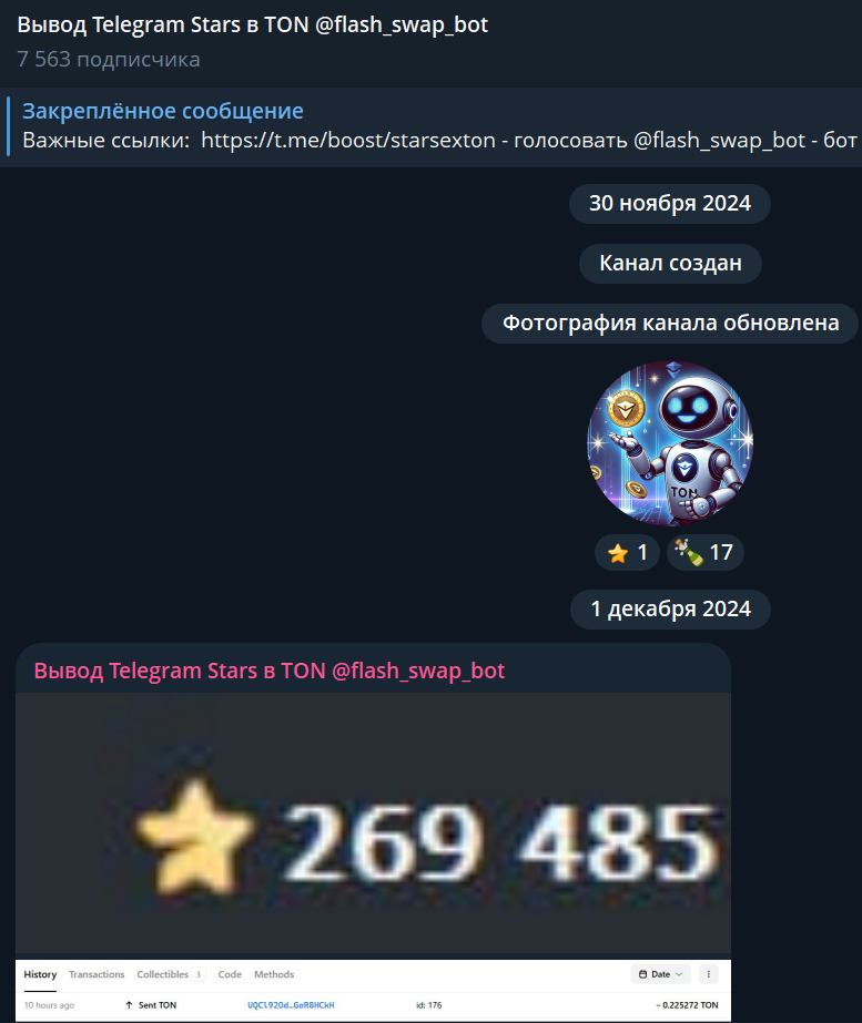 Минимальное пополнение составляет пять звезд, но нигде не указан курс, поэтому узнать об этом можно только после их отправки. Статистики у бота с ником Flash_Swap_bot нет, зато у проекта есть канал с именем @StarSexTon, который создан в ноябре 2024 года, причем подписалось на него более 7500 пользователей, но постов практически нет.