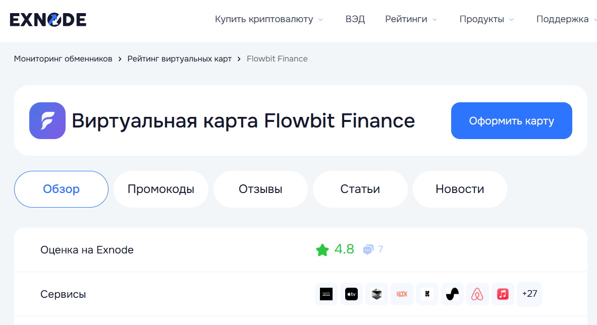 На главной странице сайта указан большой список сервисов, где можно расплачиваться картой, например, ChatGPT, Amazon, AliExpress, Binance и другие, причем для получения не требуется верификация, как сказано в разделе вопросов и ответов. Подробной информации о владельцах нет, а документы, представленные на официальном ресурсе, не показывают каких-либо данных, зато бот в Телеграмм с ником FlowbitFinance_bot добавлен на мониторинг Exnode.