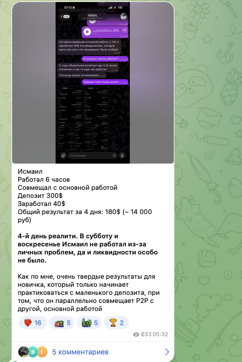 Хотя автор постоянно отчитывается о крупных заработках своих учеников, собственном доходе, продажа обучения выглядит неубедительно. Ведь если бы автор действительно зарабатывал на арбитраже крипты – он бы этим и занимался, а не продавал достаточно дорогое обучение весьма сомнительного качества.