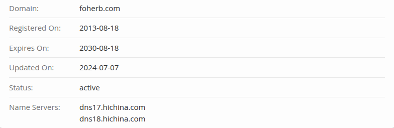 По реальным фактам отметим отсутствие страховки. Гарантии прибыль есть только на словах и далеко не факт, что каждый клиент компании FoHerb сможет заработать деньги. Ведь для плюса к прибыли надо постоянно приглашать новых партнеров. Судя по результатам проверки через WHOIS, корпорация ранее существовала с 07.07.2024 года, хотя домен действует еще с 18.08.2013 и он был куплен, чтобы выше ранжировать компанию в поисковой системе.