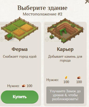 Чтобы начать игру, следует построить несколько базовых зданий, в числе которых — «Ферма» и «Лесопилка», которые приносят игровые ресурсы.