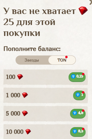 Уже на третьей минуте игрового процесса бот «Фомо Файтерс» начинает «вымогать» реальные деньги у игрока. Например, он сообщает, что для покупки очередного здания не хватает 25 «алмазов». Приобрести их можно по 1 тыс. штук за 1 TON.