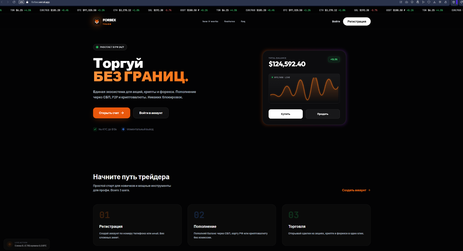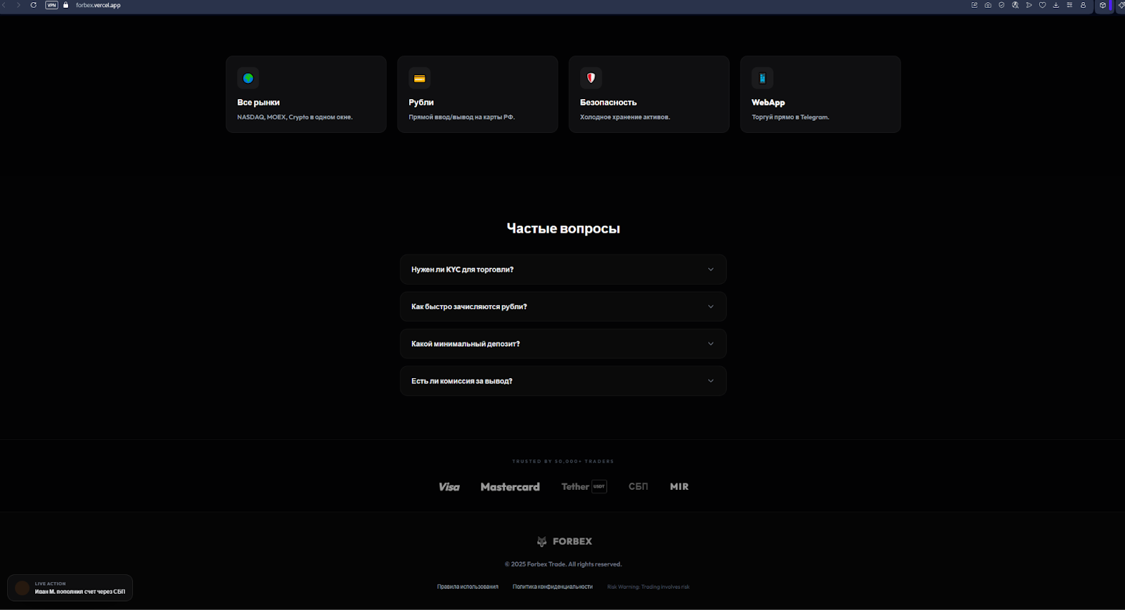 Площадка Forbex Vercel app работает на поддомене Vercel, то есть размещена на бесплатном хостинге для веб-приложений. У проекта нет собственного домена и публично доступной истории регистрации, поэтому узнать точную дату запуска невозможно. Маркетинг Forbex Trade указывает на более 50 000 активных трейдеров и единую экосистему для NASDAQ, MOEX и крипторынка, однако подтверждающих документов на сайте нет.