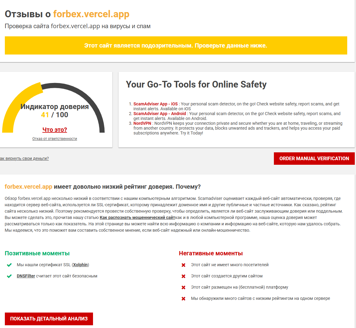 При этом сервисы проверки безопасности доменов сообщают, что Forbex Vercel app является подозрительной площадкой. Объясняется это низкой посещаемостью, множеством сомнительных сайтов на том же сервере и работой проекта через бесплатную платформу.