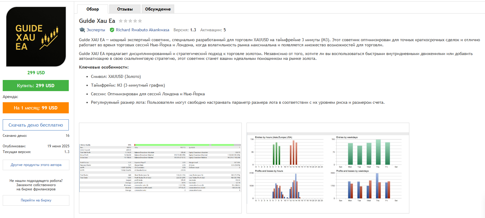 Еще одну разработку от пользователя с таким именем можно найти на сайте MQL5. Это советник для торговли XAUUSD на таймфрейме 3 минуты: