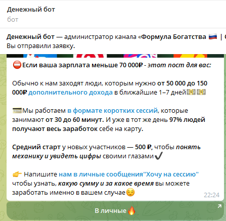 Платформа не может не произвести положительное впечатление на аудиторию, ведь на канале опубликованы доказательства выплат. И осуществление коммуникаций с валютным трейдером выглядит прозрачным. При подписке на закрытое сообщество Formula Bogatstva Strategii Rosta автоматически запускается бот-помощник «Денежный».