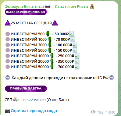 Мы проверили деятельность онлайн специалиста по криптовалюте, основавшего тг-клуб «Формула Богатства Стратегии Роста», и пришли к выводу, что автор проекта разводит пользователей на деньги. Мы не рекомендуем людям взаимодействовать с этой площадкой в ТГ.